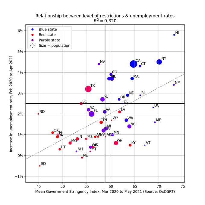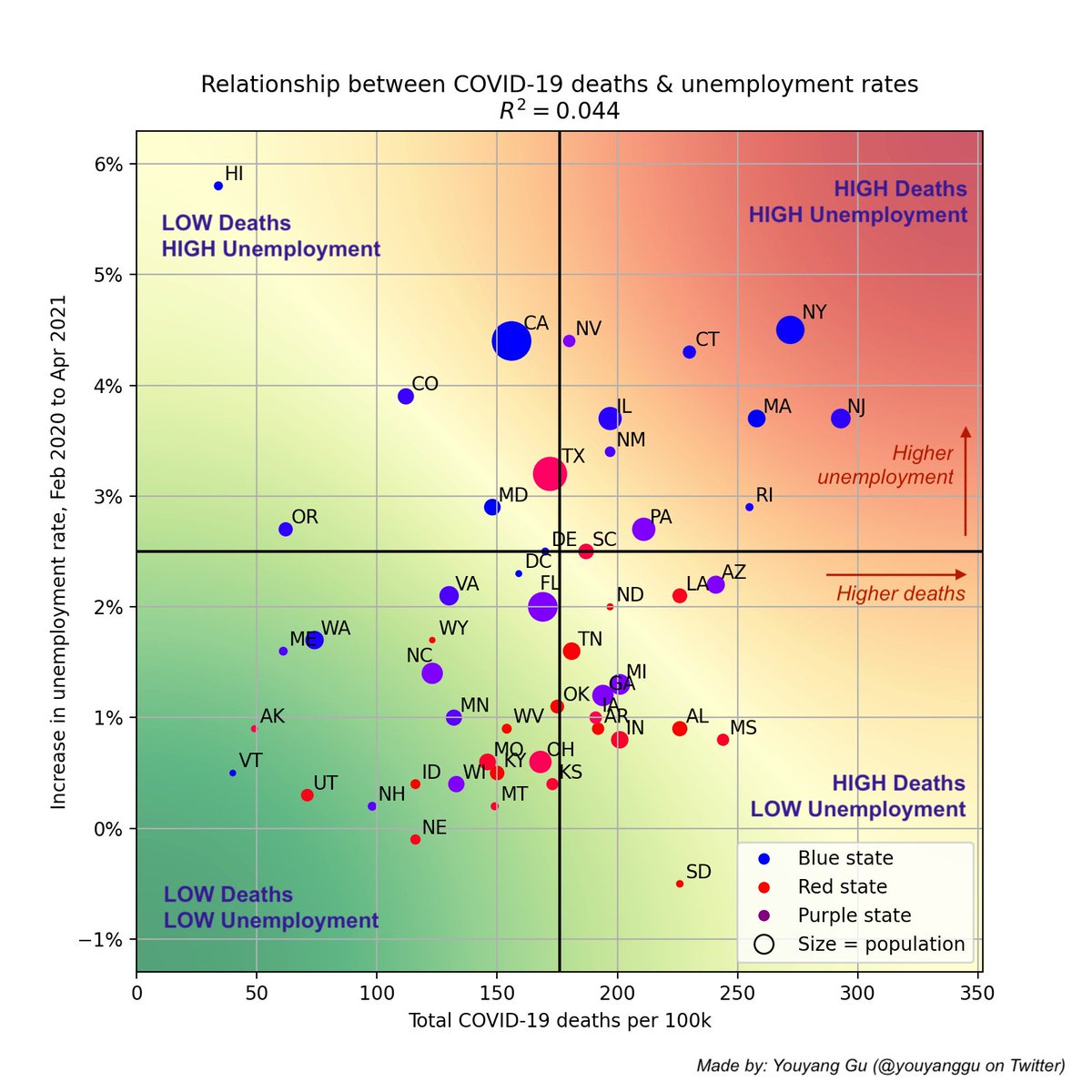 Pretty interesting graphs - drawn from the Oxford Covid-19 Government Response Tracker (OxCGRT) - that show virtually no relationship between COVID deaths per capita and unemployment rate