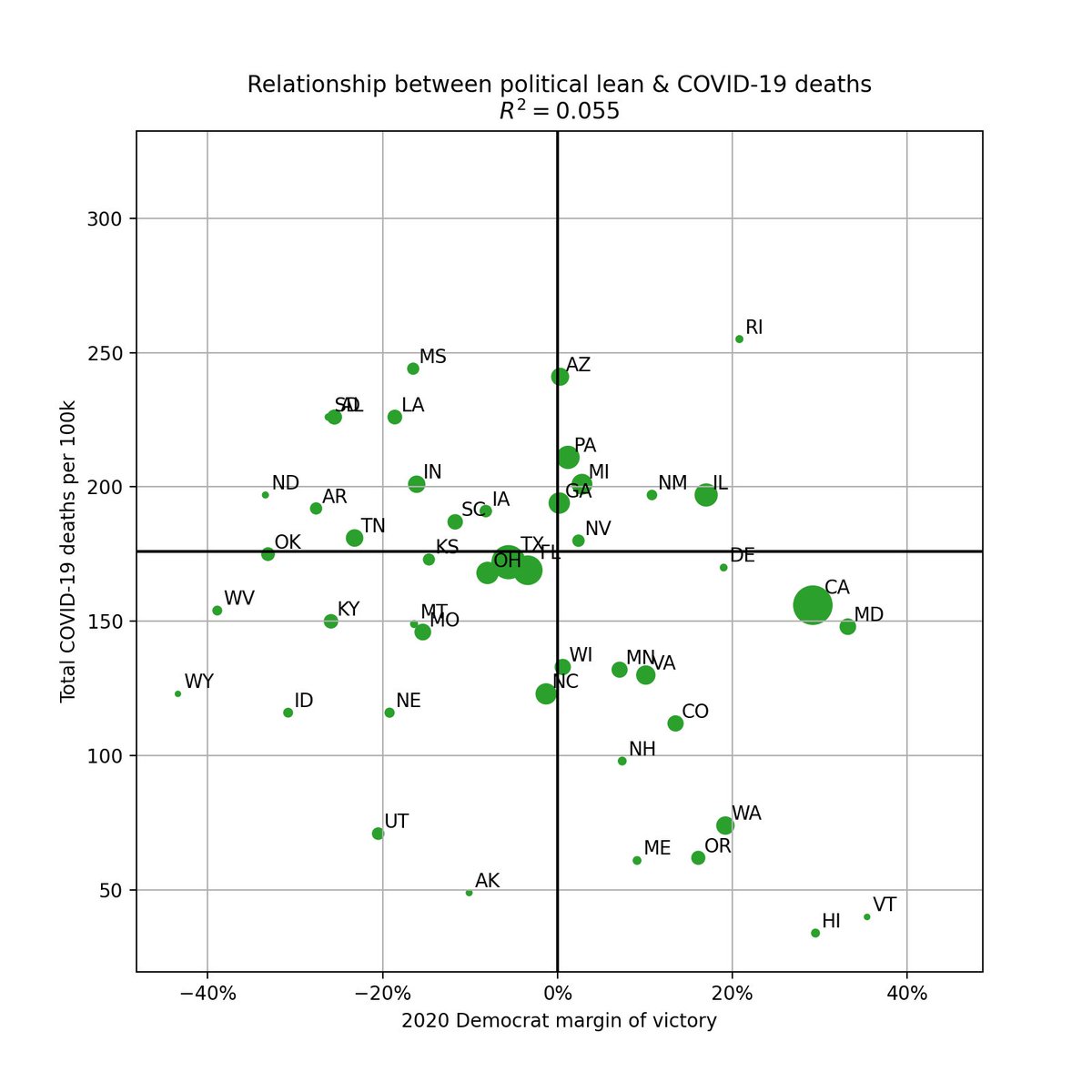 * No relationship between Democrat vote share and COVID deaths per capita, even when excluding the early hit states like NY, NJ, CT, and MA