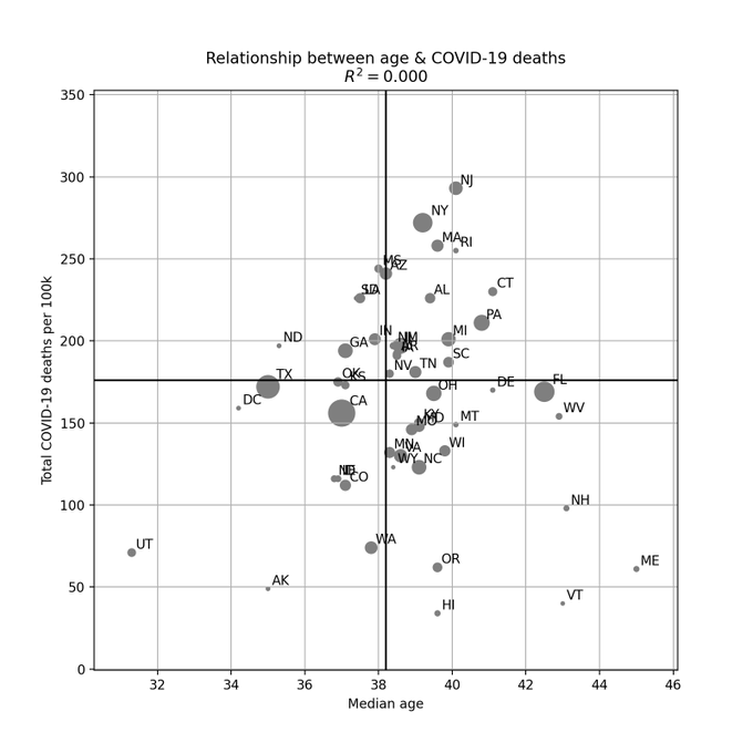 * Virtually no relationship between COVID deaths per capita and median age of state, population per square mile of state, urban population percentage of state, or income per capita of state